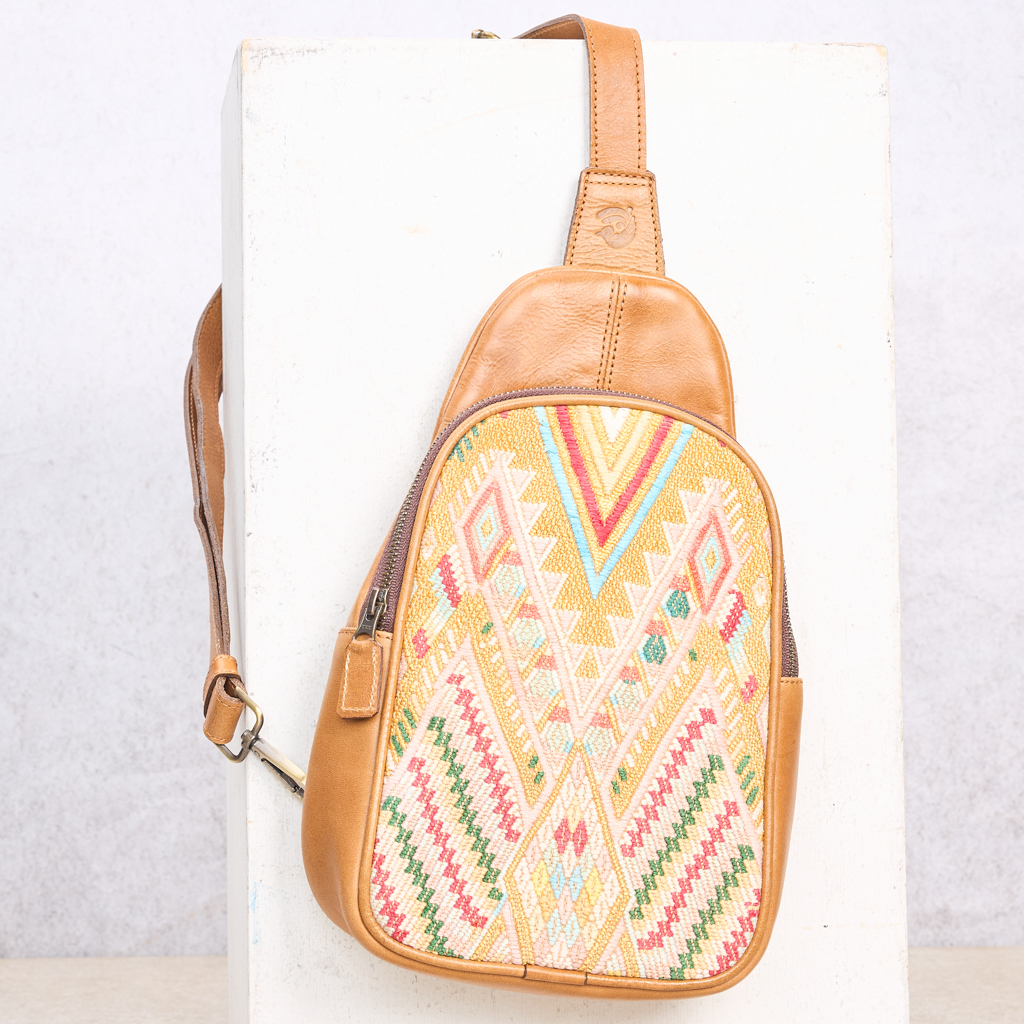Each Diego Sling with vintage textile is completely one-of-a-kind and incredibly special. The handwoven fabric on each bag was once worn as a Mayan huipil (blouse) and was ethically sourced and mindfully repurposed by our Mayan partnerships in Chichicastenango, Guatemala. Each purchase directly supports artisan families, helping them reach their economic goals.