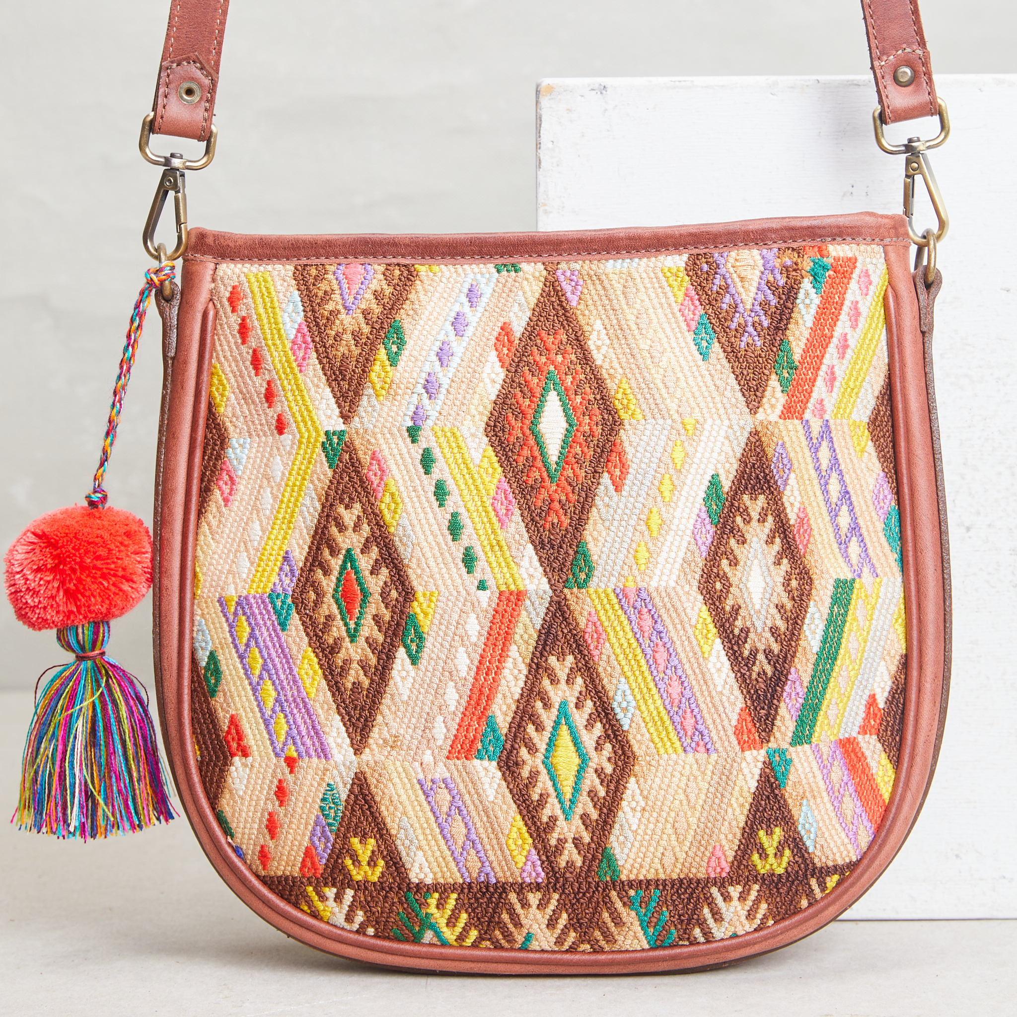 The Gia is a convenient crossbody in a classic saddlebag shape that will be your favorite sidekick. It features a stunning, hand-woven vintage huipil (traditional Mayan blouse) panel that has been upcycled and given a new life by our Guatemalan artisan partners. Each is one-of-a-kind and a true work of art full of rich symbolism and history. We source these beautiful, rare textiles from our Mayan partnerships, and our pieces celebrate the strong women who create them.