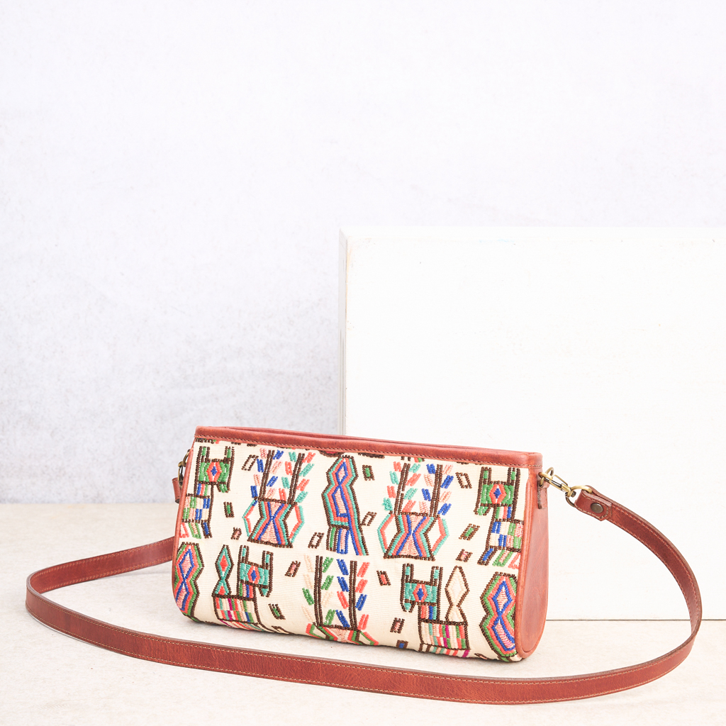 The Rio with textile has the same features as our all-leather version, but with the addition of a stunning one-of-a-kind vintage design that wraps around the entire bag. The handwoven fabric was once worn as a Mayan huipil (blouse) and was ethically sourced and mindfully repurposed by our Mayan partnerships in Chichicastenango, Guatemala.