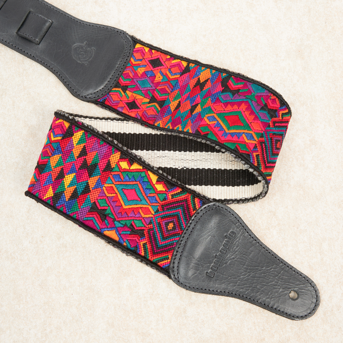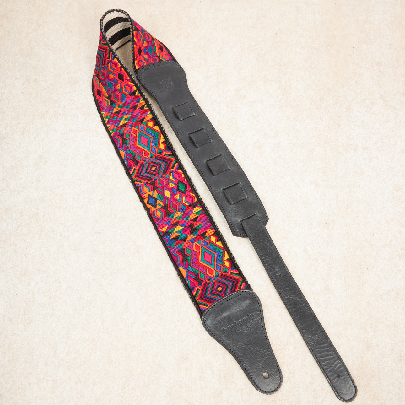 In many ways, music is life itself. Accent your guitar with a handcrafted, one-of-a-kind strap created from an original vintage, hand-embroidered “faja” (fa-ha). Each piece has an individual beauty of its own; inspiring, soulful and perfectly imperfect… much like the musician who will wear it. The full-grain leather accents are handcrafted to make the piece fully adjustable and extremely comfortable on the shoulder.